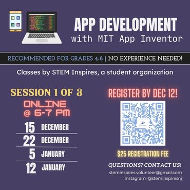 STEM Inspires team offered an online App Development Course to elementary and middle school students. The students learned fun coding concepts with MIT App Inventor, an app development platform that's beginner-friendly. The session spanned 4 classes from mid December to mid January.